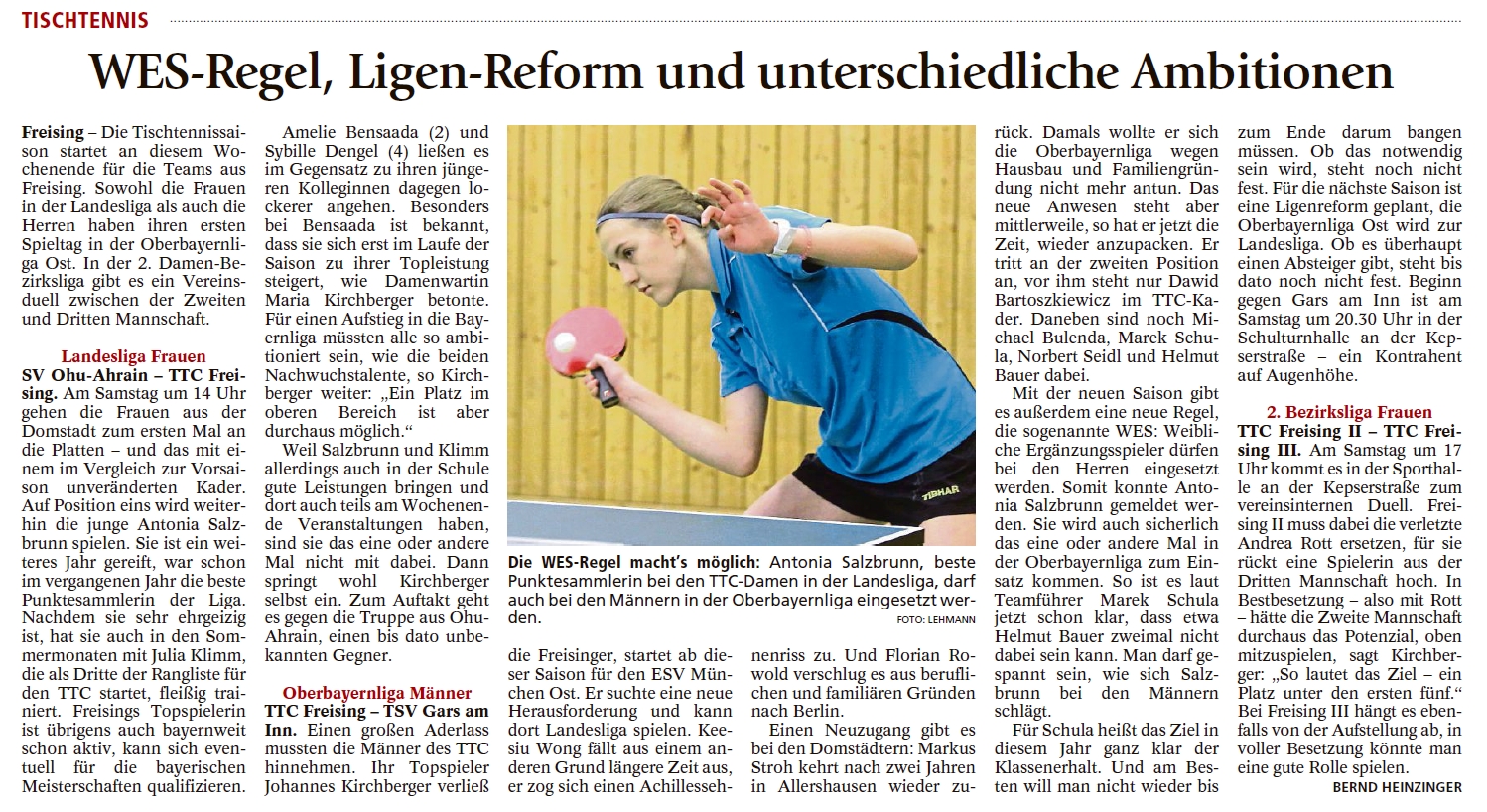 Freisinger Tagblatt vom 21.09.2017: WES-Regel, Liga-Reforn und unterschiedliche Ambitionen Posted on 21. September 2017 by Markus ACHTUNG: Das Spiel der Herren 1 findet am Freitag (22.09.2017) um 20:30 Uhr statt und nicht am Samstag !!! Klicken, um zu das Bild zu vergrößern !